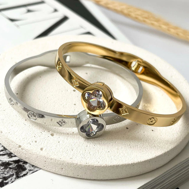 Bracelete inspiração, em banho dourado e em banho prata , abertura frontal. Modelo tendência