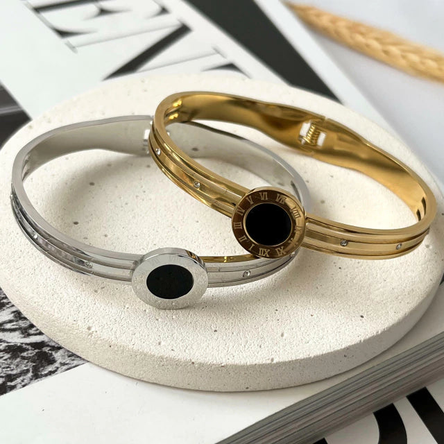 Bracelete inspiração, em banho dourado e em banho prata , abertura frontal. Modelo tendência