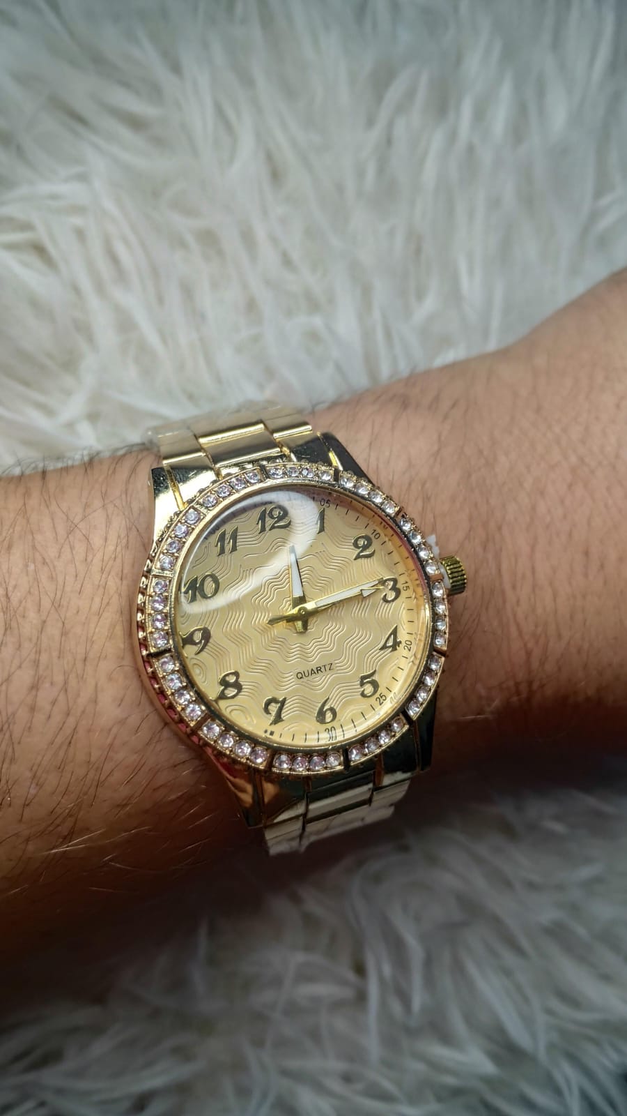Relógio social, minimalista, visor redondo com detalhes e zircônia , tamanho médio e com pulseira em formato elástico, sem abotoadura